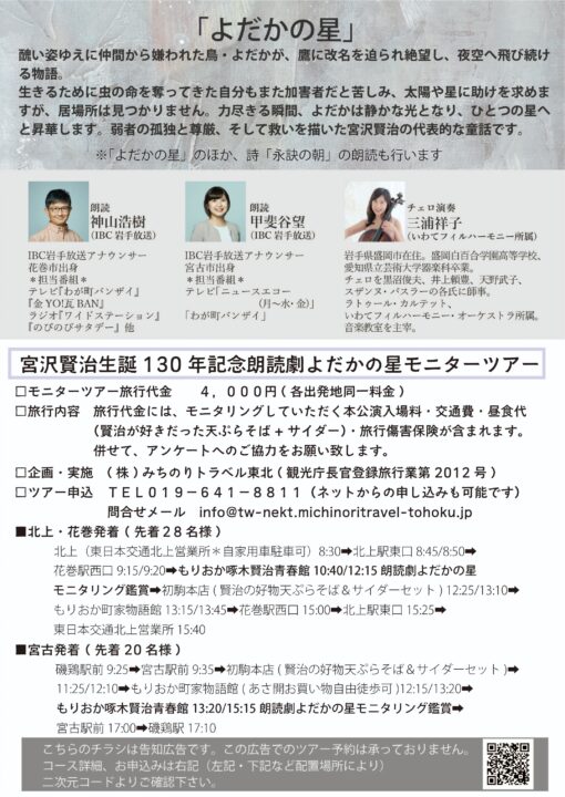 開催される朗読劇「よだかの星」に、甲斐谷アナと出演します。