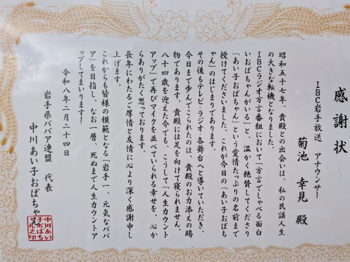 感謝状をいただき、私の方が感謝です。