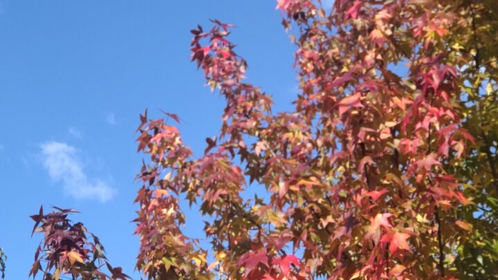 全山紅葉の季節も間もなくですが、平地でも色づき始めた木々の葉が真っ青な秋空をバックに美しいコントラストを描いています。