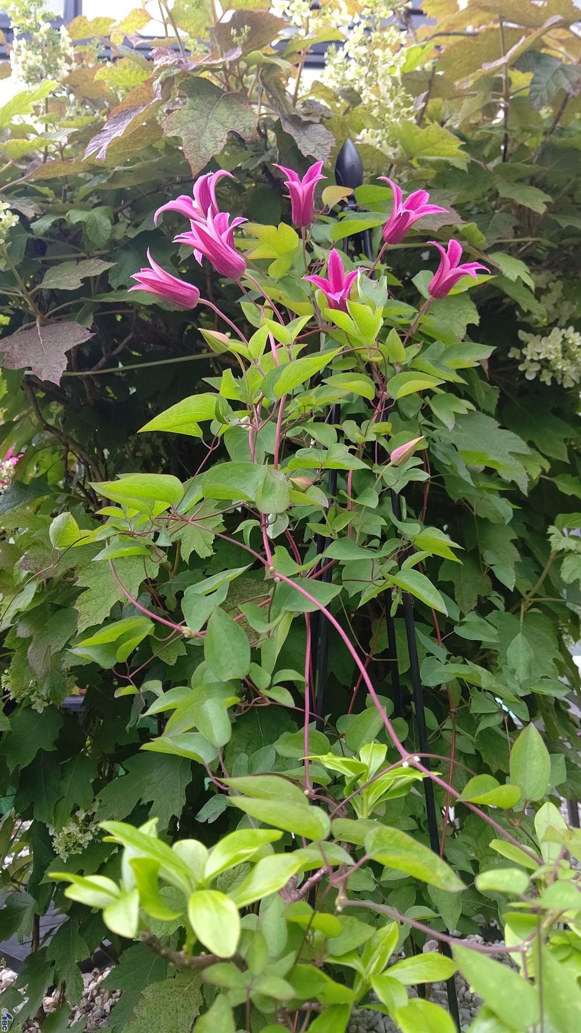 後ろで咲きだした白い花はカシワバアジサイですね。