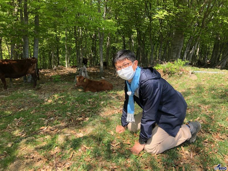 山で放された牛たちが緑の芝でくつろぐ姿が