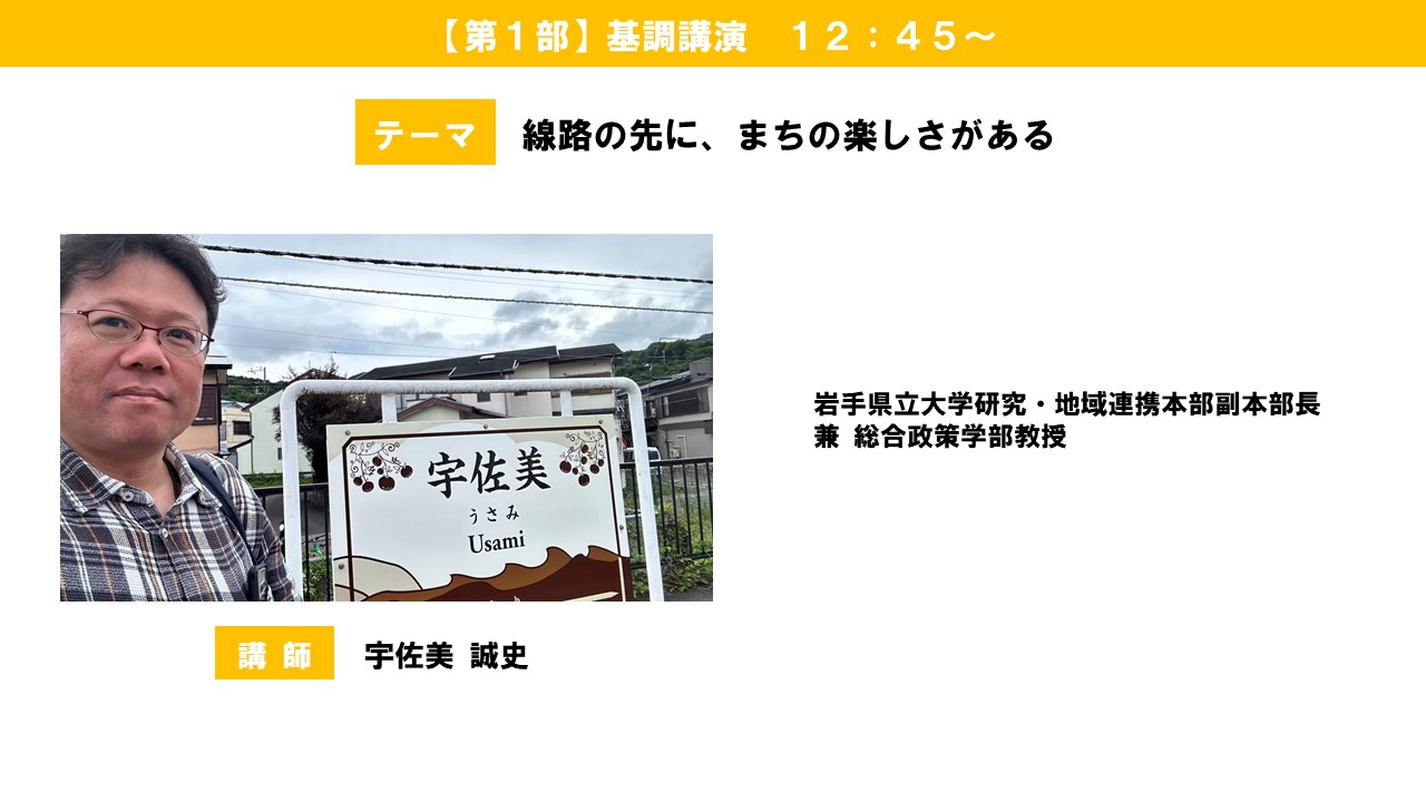 『線路の先に、まちの楽しさがある』 --- 講師 --- ●宇佐美 誠史 (岩手県立大学研究・地域連携本部副本部長 兼 総合政策学部教授) |