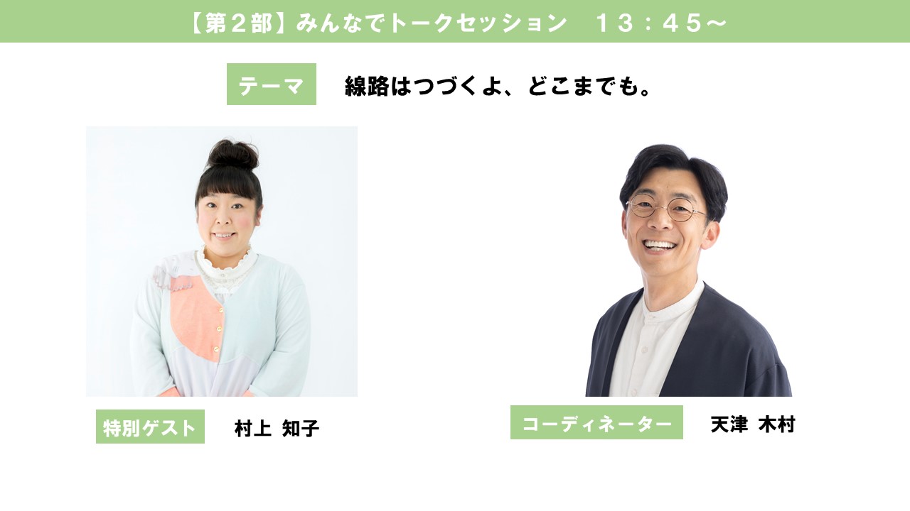 『線路はつづくよ、どこまでも。』 --- 特別ゲスト --- ● 村上知子(森三中) (お笑いタレント) --- 進行・コーディネーター --- ●天津 木村 (いわて応援芸人/吉本興業) |