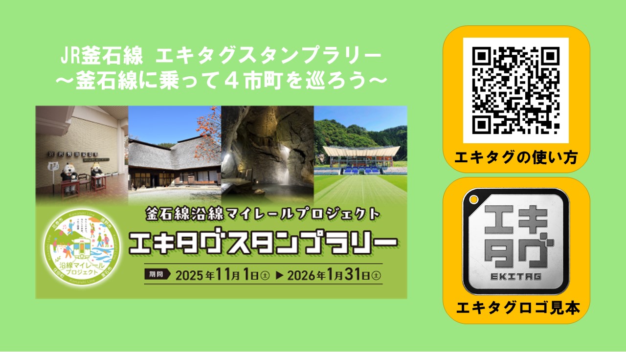 事前申込 先着200名様または釜石線エキタグ利用の方 先着150名様に オリジナルグッズをプレゼント! (おひとり様ひとつまで) 当日、会場にてお渡しします! ※事前申込の方法やグッズデザインは本ぺージ下部をご確認ください。 【釜石線エキタグについて】 JR釜石線に乗って、エキタグスタンプを集めよう! *釜石線の駅スタンプを1つ以上獲得されている方が対象です 当日画面提示でプレゼントと引き換えいたします。 アプリの使い方や詳細は下記をご覧ください。 釜石線エキタグ利用について 釜石線エキタグチラシ |