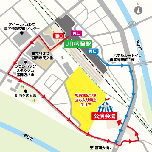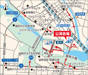 ●車両、歩行者ともに会場の出入り口は【盛岡駅側 盛南大橋袂の交差点 北上川方面に下る道路】一か所のみとなります。開演前は混雑が予想されますので、時間に余裕を持ってご来場ください。