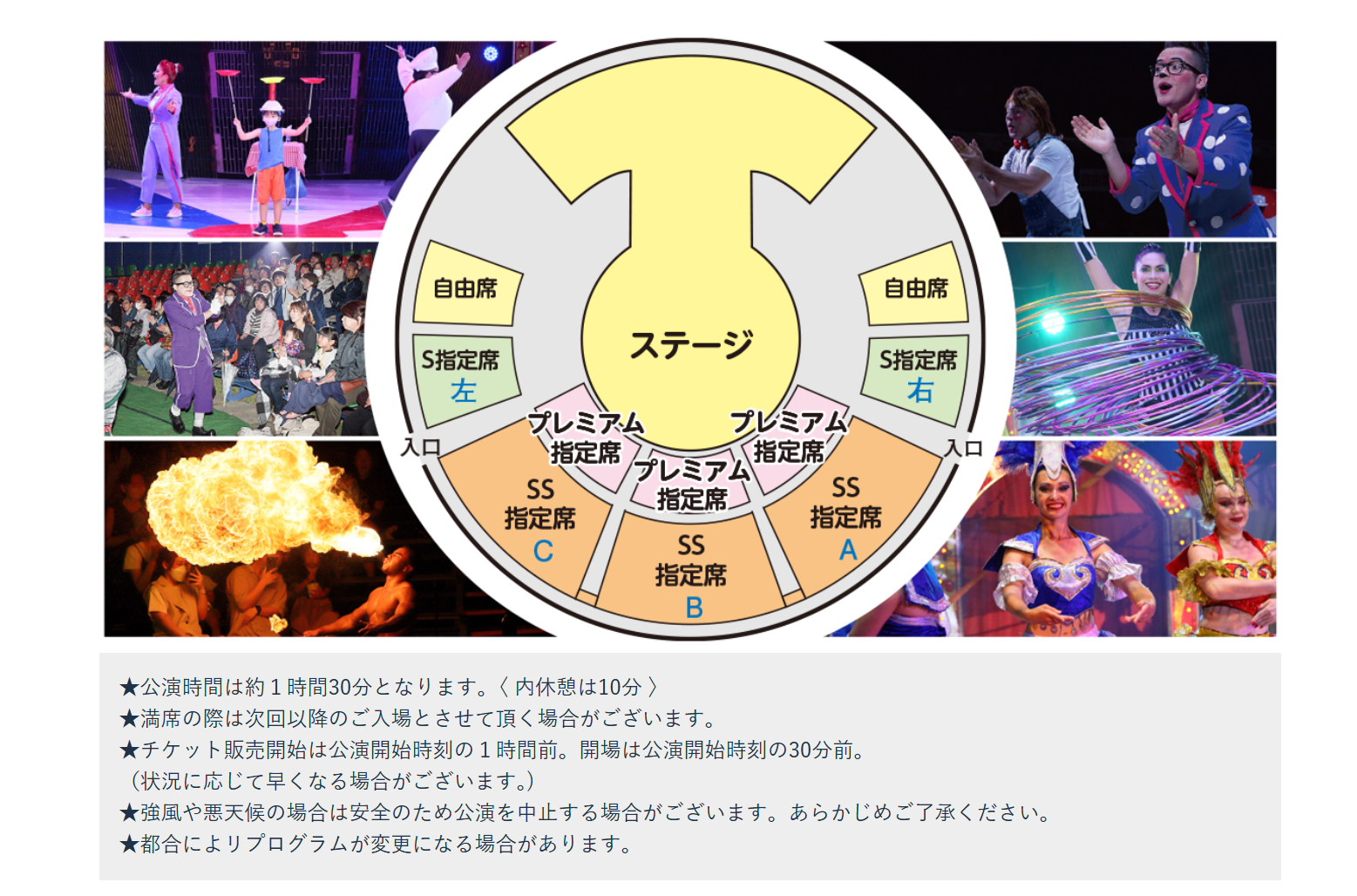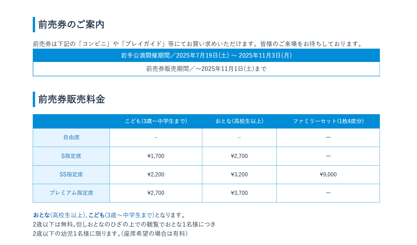 大人 :2,500円 子ども:1,500円(前売券販売なし) 【S席】 大人 :3,000円 子ども:2,000円 【SS指定席】 大人 :3,500円 子ども:2,500円 【ファミリーセット(4名)】 9,000円(前売り券のみ販売) 【プレミアム指定席】 大人 :4,000円 子ども:3,000円 ※価格はすべて当日券、前売券は記載金額より300円引き |