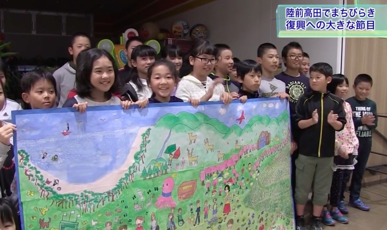 セレモニーに参加した地元の矢作小学校の児童たちは未来の陸前高田を絵にして発表しました。震災からの復興、かさ上げ地を中心とする自然豊かなまちに笑顔いっぱいの人々が描かれています。