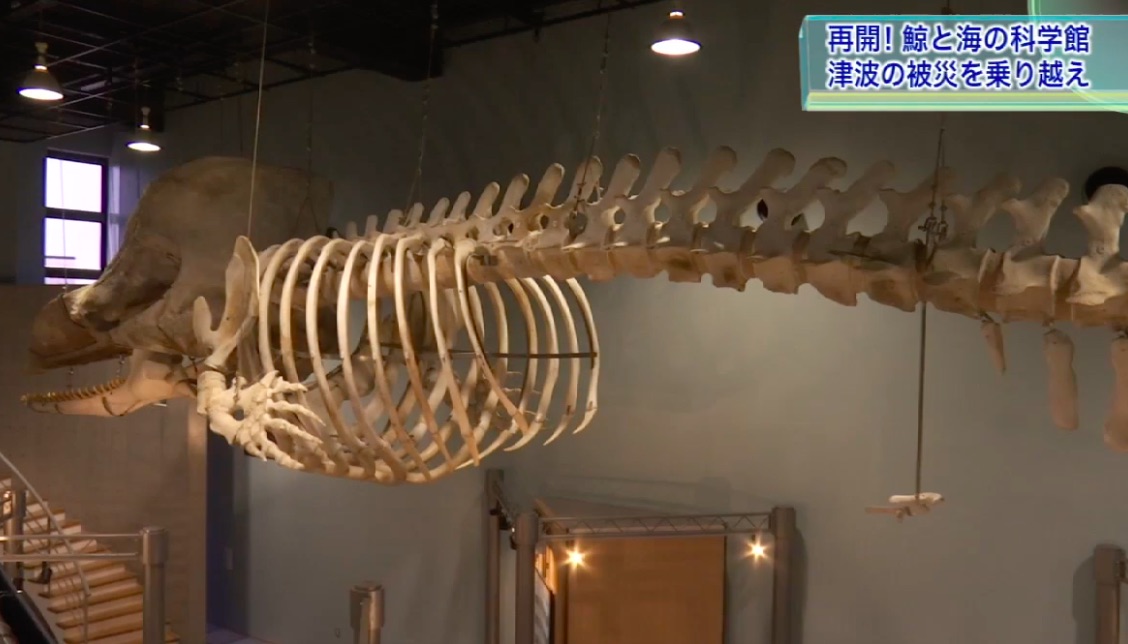 復旧した鯨と海の科学館は鉄骨造り2階建てで延べ床面積はおよそ2000平方メールです。国の災害復旧事業などを活用し元の姿に戻しました。まずは科学館のシンボル、マッコウクジラの骨格標本です。