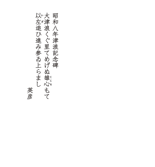 石碑は1933(昭和8)年の大津波の惨状を伝えており、発生から3年後に建てられた。当時の長内村長らが義援金を活用し建立したとみられ、支援への感謝と復興への誓いが記されている。