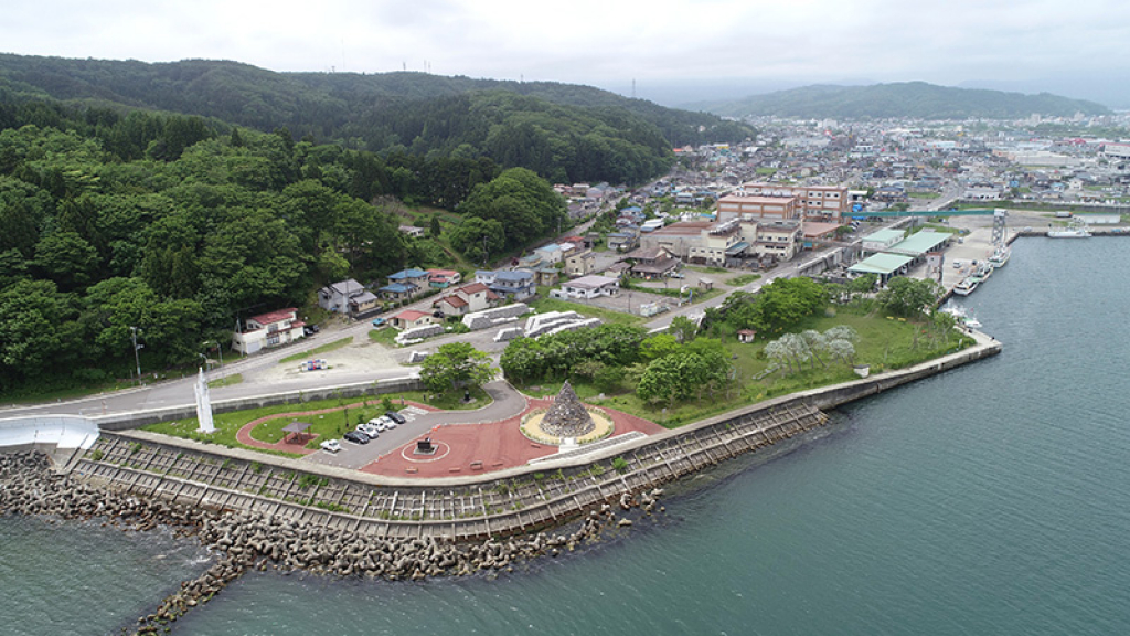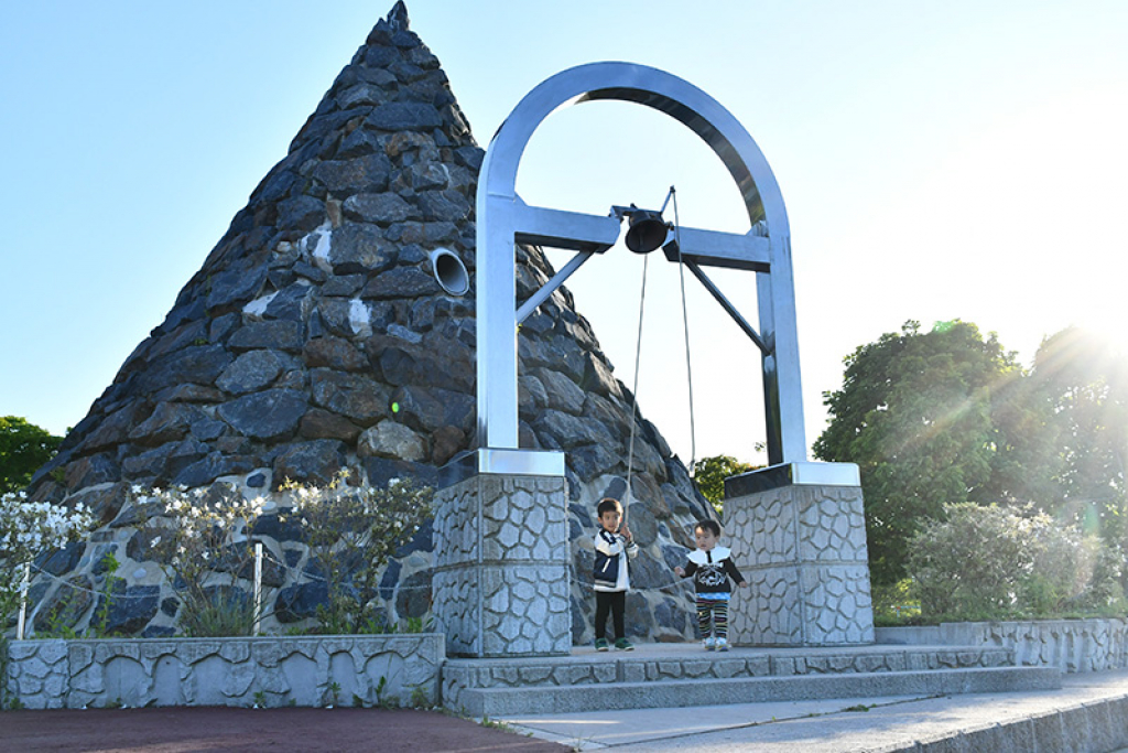 津波記念碑の立つ諏訪神社ふもとから約200メートル。久慈港に隣接する公園「諏訪緑地」に、標高14・5メートルの円すい形のモニュメントがある。名は「ケルン・鎮魂の鐘と光」。東日本大震災を忘れないよう、地域住民が力を合わせて建てた「思い」の塔だ。