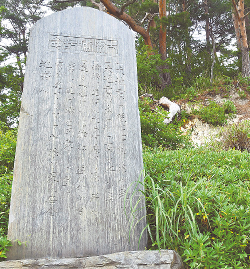 大海嘯記念碑には「大地震の後には津波が来る」など五つの教訓が記されている。裏側に目を向けると、発生時間や当時の宮古地内の被害(流失4戸、溺死者2人)、建立の経緯などが詳細に刻まれている。東日本大震災の津波で一度は海中に流されたが引き上げ、今は元の場所に収まっている。