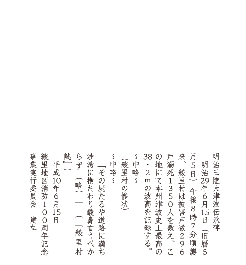 綾里地区消防100年の歩みを収めた記念誌「金馬簾(きんばれん)」は明治三陸大津波伝承碑が除幕された1998年6月当時の模様を刻んでいる。除幕式では綾里が地元の津波研究家・故山下文男さんが碑文の解説を務めた。「本州津波最高到達地点に碑建立」「悲惨な記憶を後世に」と当時の新聞も大々的に報じた。