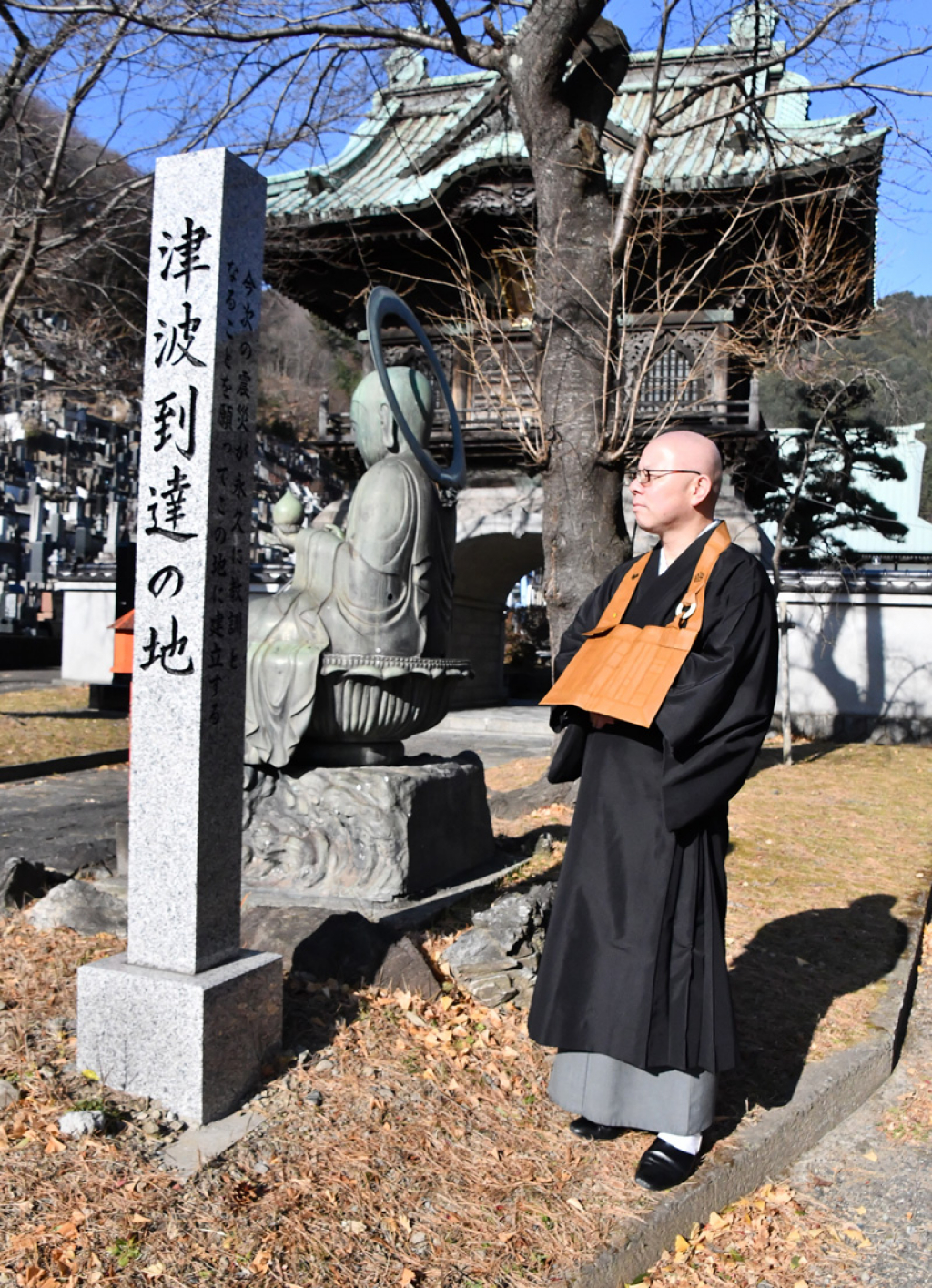都築住職は2013年、境内に新たな石碑を建立した。碑文には「永久に教訓となることを」の文字。「通りすがりに、震災に思いをはせてほしい」と願う。