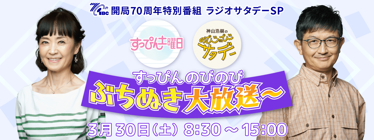 IBC岩手放送は昭和28年(1953)12月25日、「県民のラジオ」となることを目指し「ラジオ岩手」を開局しました。IBCラジオでは70周年のアニバーサリーイヤーの締めくくりとして「すっぴん土曜日」「神山浩樹ののびのびサタデー」をぶちぬき、6時間半の生放送特別番組でお届けします。