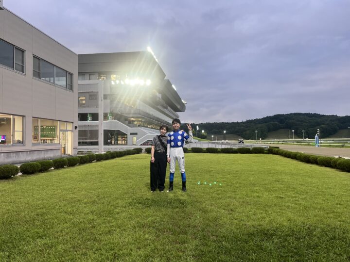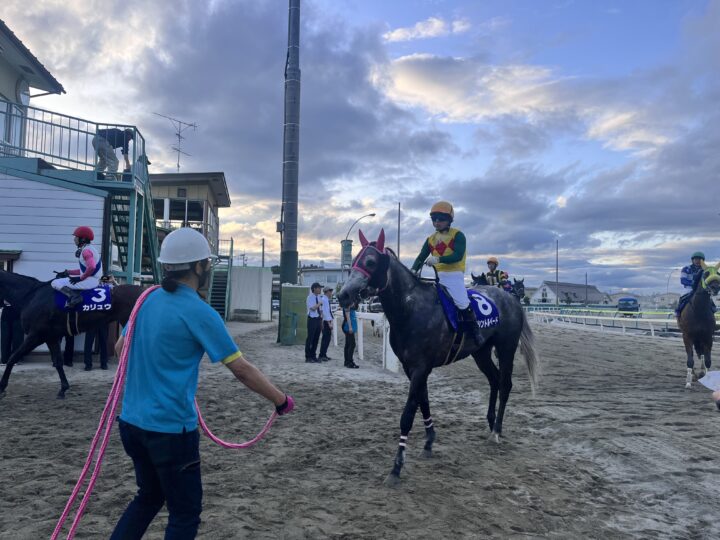 過去JRA=中央競馬時代に芝コースを経験した馬は多かったものの、オーロパークの芝を走ったことのある馬はエイシンダリア1頭のみ。芝適性が未知数な馬が多く混戦模様となりました。1番人気はゲレル。JRA札幌の未勝利戦で3着の実績が買われて売り出しから抜けた1番人気となりました。以下は人気が割れ、ダートで今年3勝をあげているリュウノドラゴン、今季高い入着率を誇るアイヨトワニ、中央1勝クラスでもまれた経験のあるフタイテンホイールの順番となりましたが、それ以下の人気の馬も実績は大差なく波乱含みの一戦となりました。スタート直後8枠11番のサンカリプソが飛び出し先手に出ました。厩舎サイドから逃げられれば行っていいとの指示を受けていた坂井瑛音騎手は、重賞で騎乗するのはもちろん、芝コースのレースも初めてでした。デビュー2年目で巡ってきたチャンスを生かすべく、後続に水を開けながら逃げまくりました。人気のゲレルはマナホクラニの後ろ3番手、リュウノドラゴンは4番手で進みました。勝負どころの第3コーナー、多くの場合有力馬が差を詰める局面ながら、サンカリプソの逃げは冴え、かえって差を広げます。2馬身の差を保って最後の直線、坂井瑛音騎手は目いっぱいに追い、脚の鈍りかけたサンカリプソを鼓舞しました。ようやくゲレルとリュウノドラゴンが差をつめますが、2分の1馬身差でサンカリプソが逃げ切り勝ちを収めました。デビュー1・2年目での重賞制覇は過去にも例がありますが、重賞初騎乗。且つ芝初体験での重賞制覇は過去に例のない快挙でした。たまたま観戦に訪れた母とのツーショットもほほえましく。レース後は祝福ムードに包まれました。