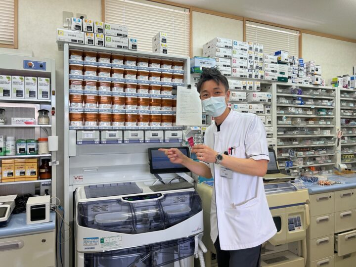 馬場さんが指さしているのは、あさひ薬局の分包機。体験の時には、機械内部の仕組みがよりわかるような機械を使うのだそうです!