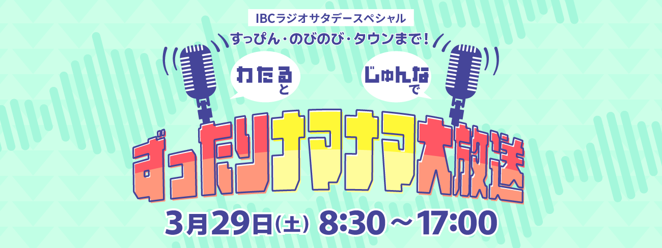 土曜日レギュラーの「すっぴん土曜日」「神山浩樹ののびのびサタデー」「大塚富夫のTOWN」をドッキング。特別番組として、北上市出身のTBS小笠原亘アナウンサー、盛岡市出身のTBS山形純菜アナウンサーをスペシャルゲストに迎え、ずったり5時間超(11:40から。山形アナは15:00まで)!