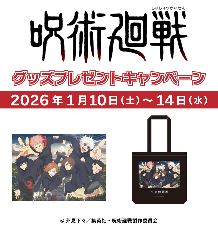 アニメーション呪術廻戦展「懐玉・玉折」「渋谷事変」のクリアポスターとトートバッグのセットを抽選で4名様にプレゼント!