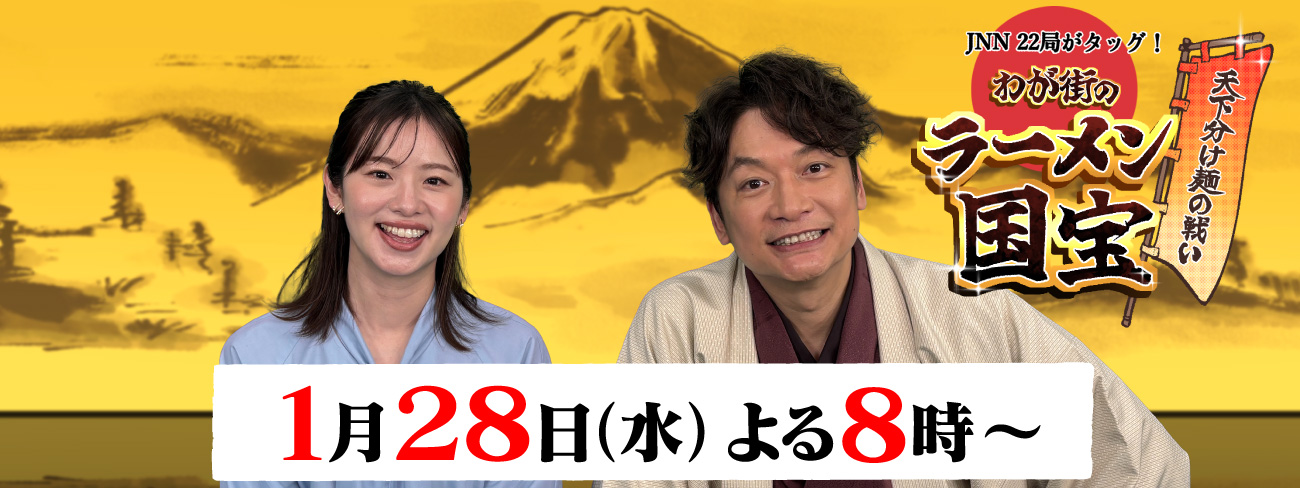 JNN22局がタッグ!天下分け麺の戦い わが街のラーメン国宝🍜🍜 香取慎吾が国宝級のラーメンを選ぶ!! 歴史、産業、そして人間の物語が隠された“お国自慢”の「ご当地ラーメン」。 ありとあらゆる手段を使った猛アピール合戦が、スタジオで繰り広げられる! はたして、国宝級ご当地ラーメンの頂点に立つのはどの1杯なのか!?