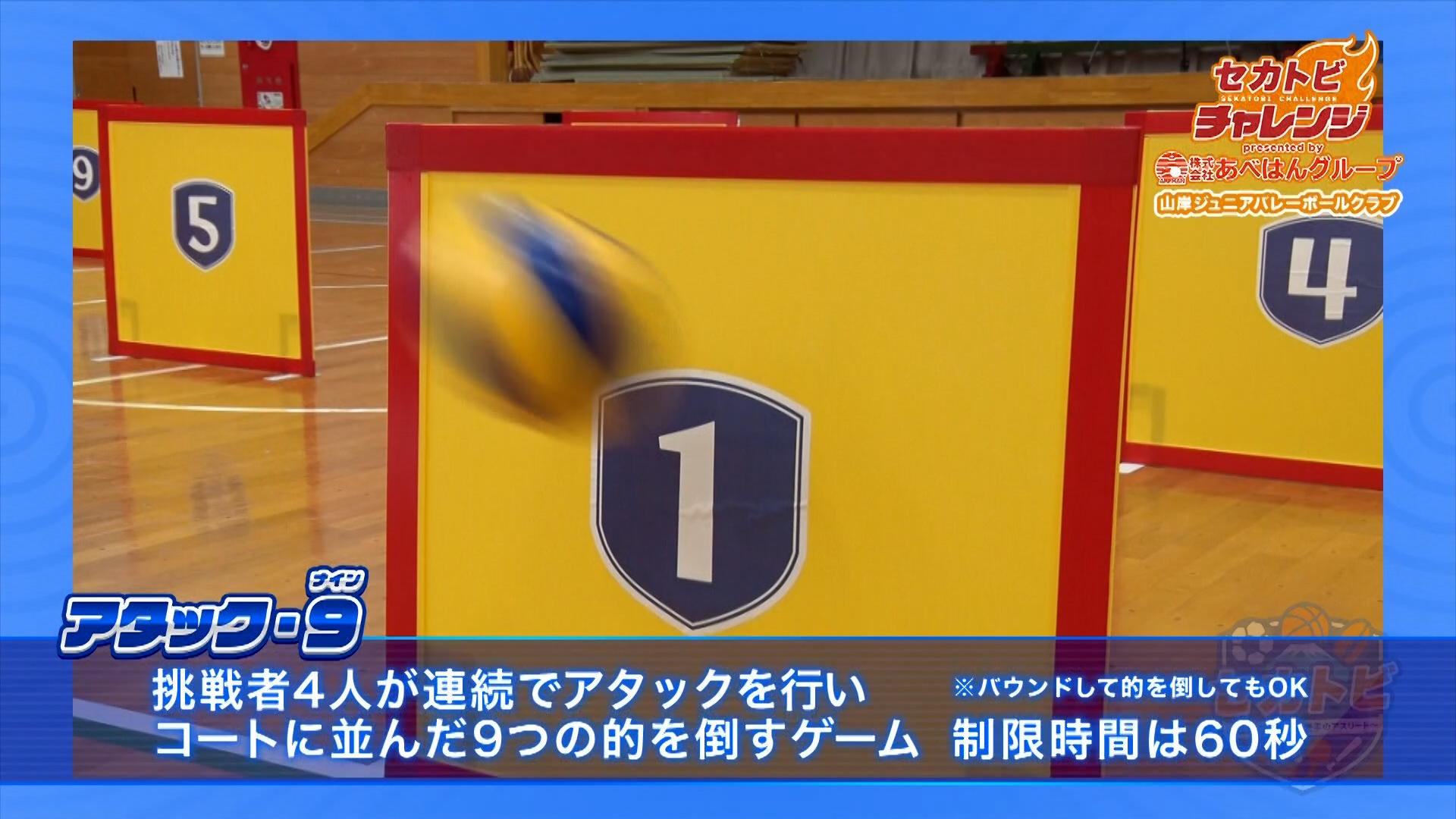 山岸ジュニアバレーボールクラブがコートに並んだ9つの的をアタックで倒す『アタック・9』に挑戦!
